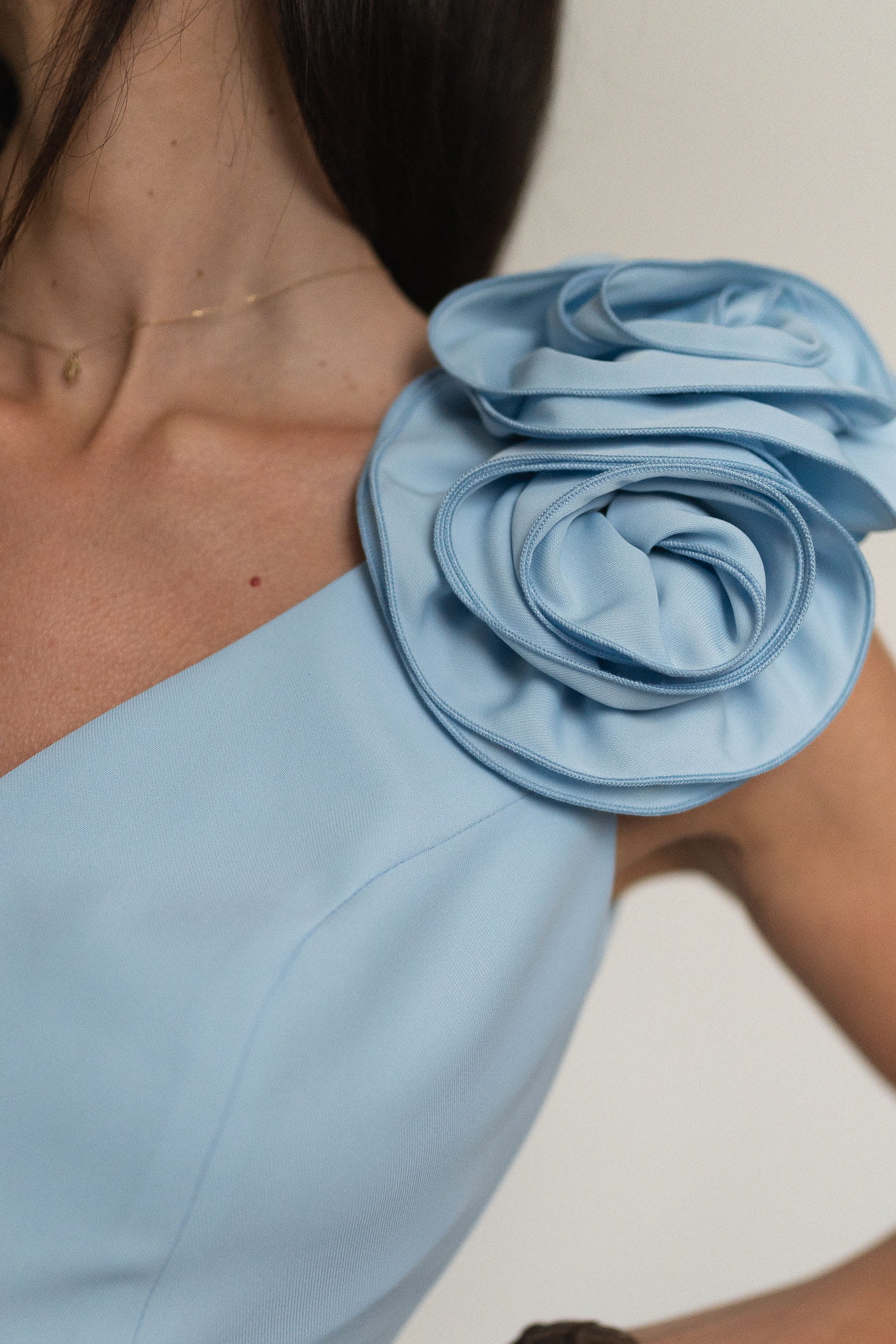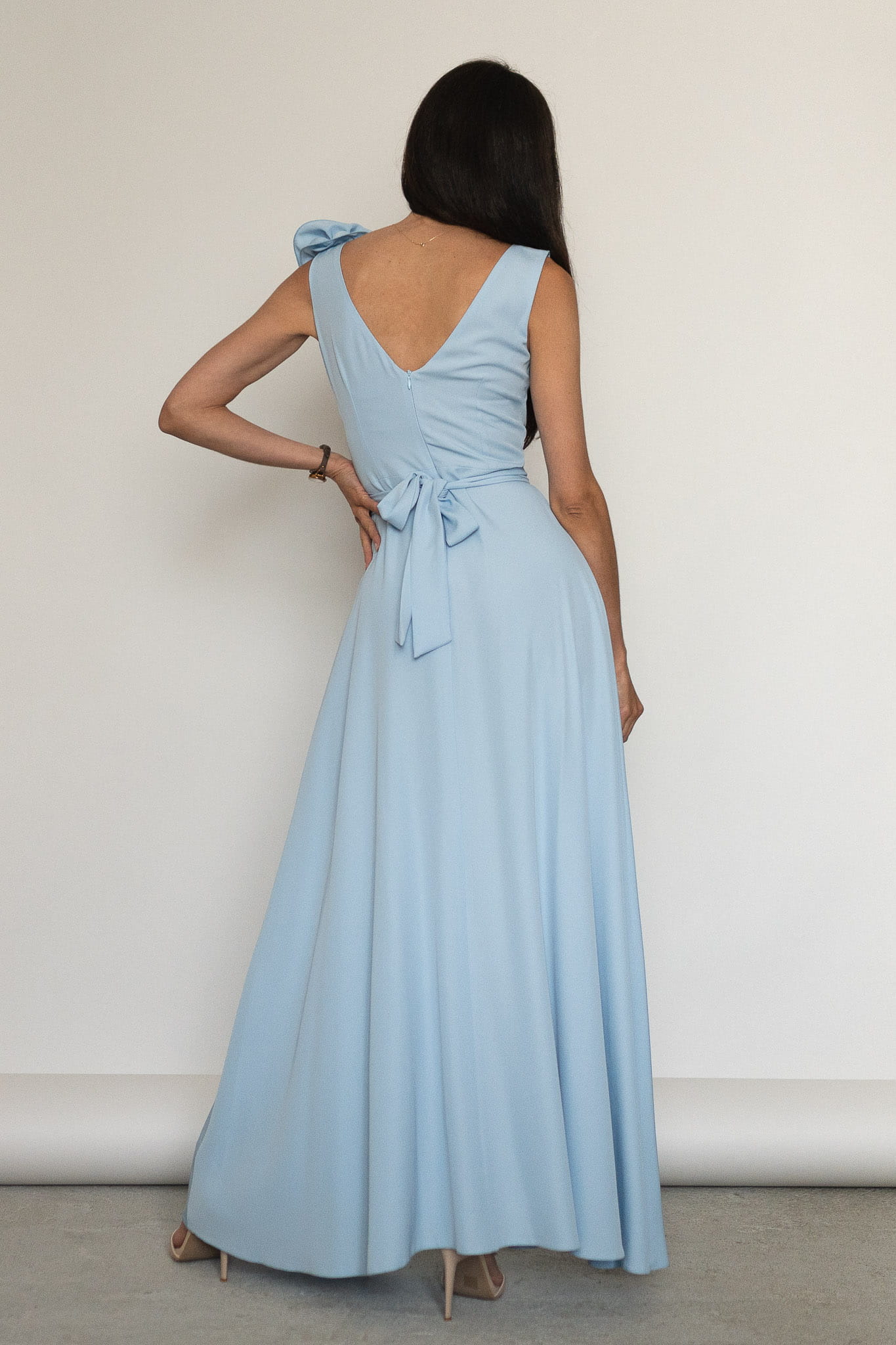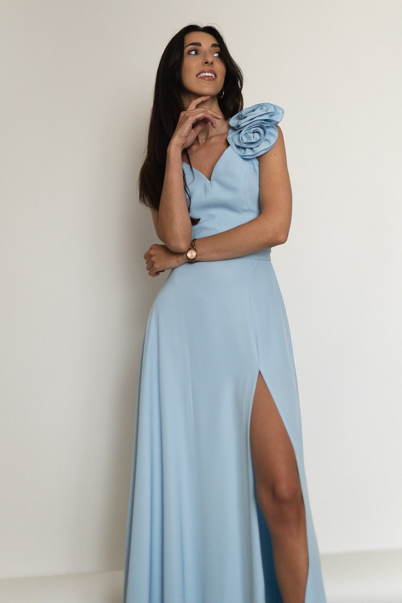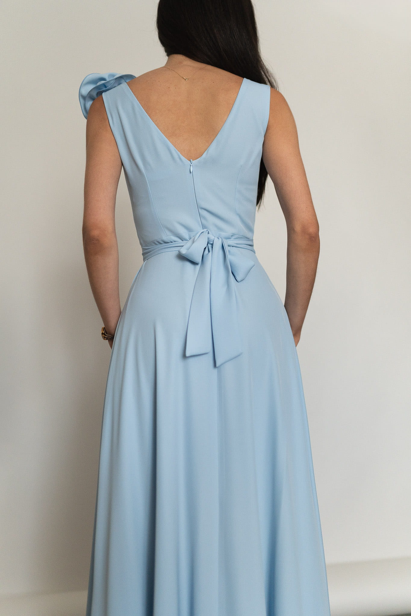 Elegancka sukienka długości maxi o lekko rozkloszowanym dole z rozcięciem na nogę. Model na grubszych ramiączkach z dekoltem w serek z przodu i z tyłu. Odpinana róża 3D dodaje uroku i tworzy efektowny element stylizacji. Sukienka sprawdzi się na wesele, chrzciny, komunie, andrzejki, sylwestra, studniówkę, zabawy karnawałowe czy inne wyjątkowe okazje. Tkanina jest lekka i pięknie porusza się w ruchu. Sukienka posiada podszewkę i pasek w kolorze w zestawie, którym możesz dodatkowo podkreślić talię. Dostępna w rozmiarach od 34 (XS) do 46 (XXXL).