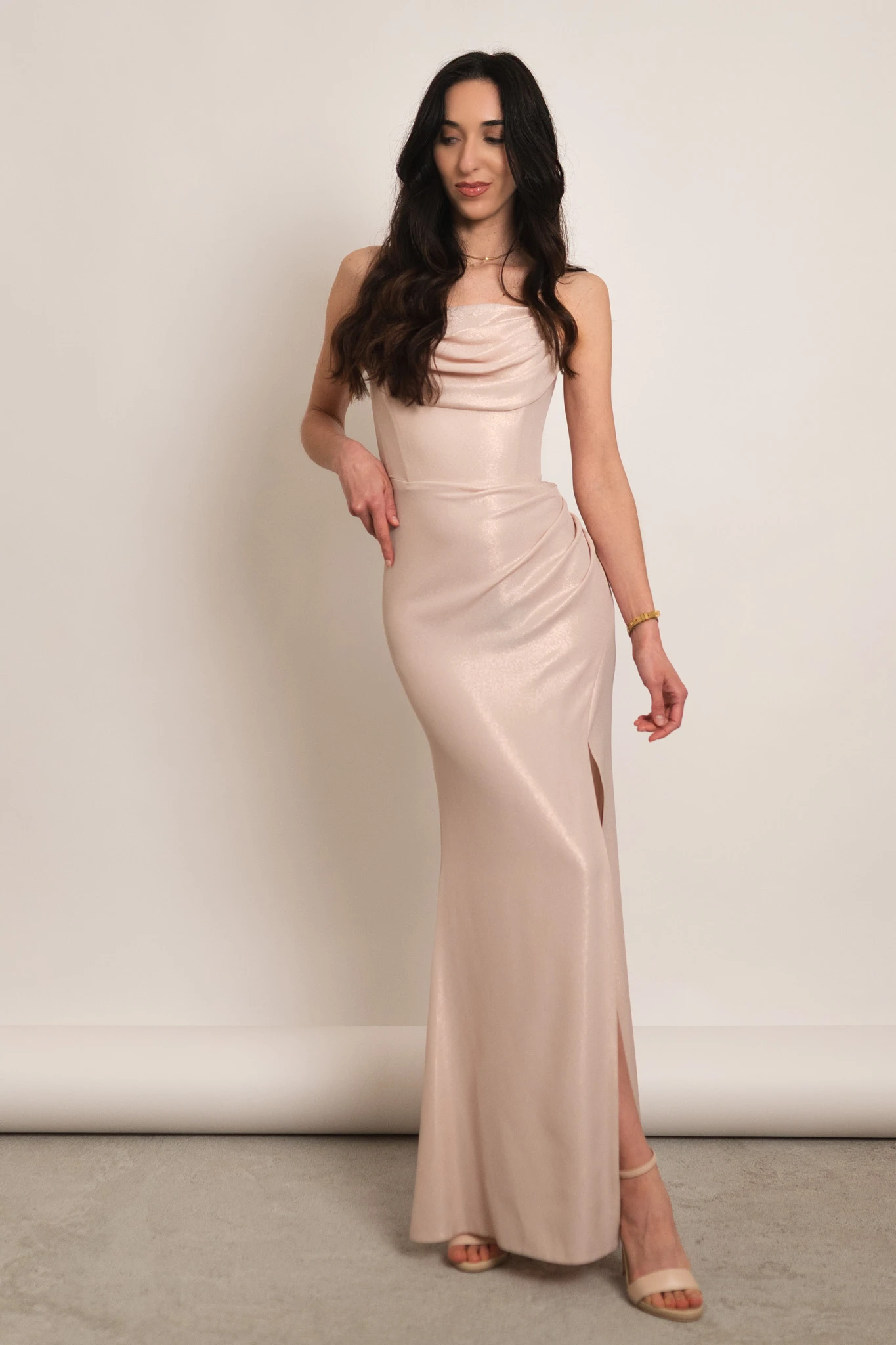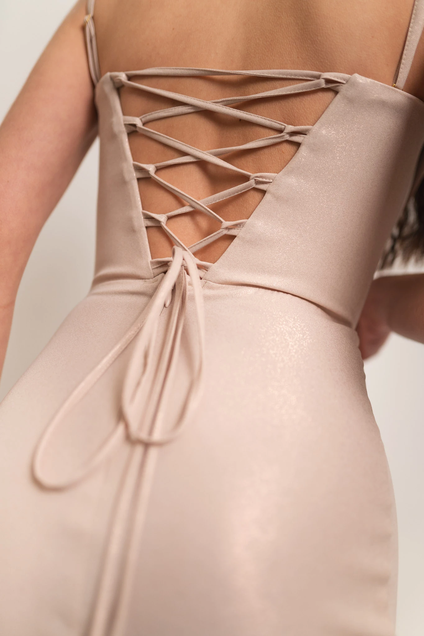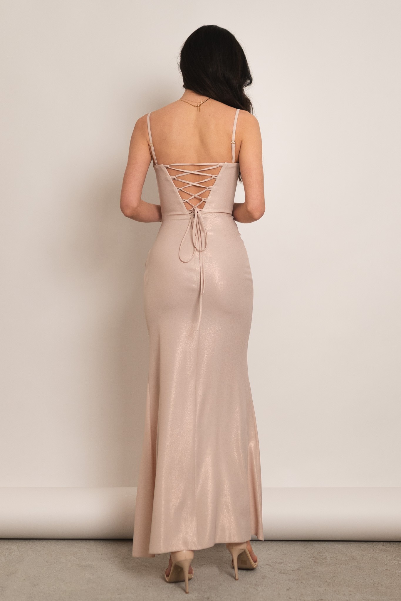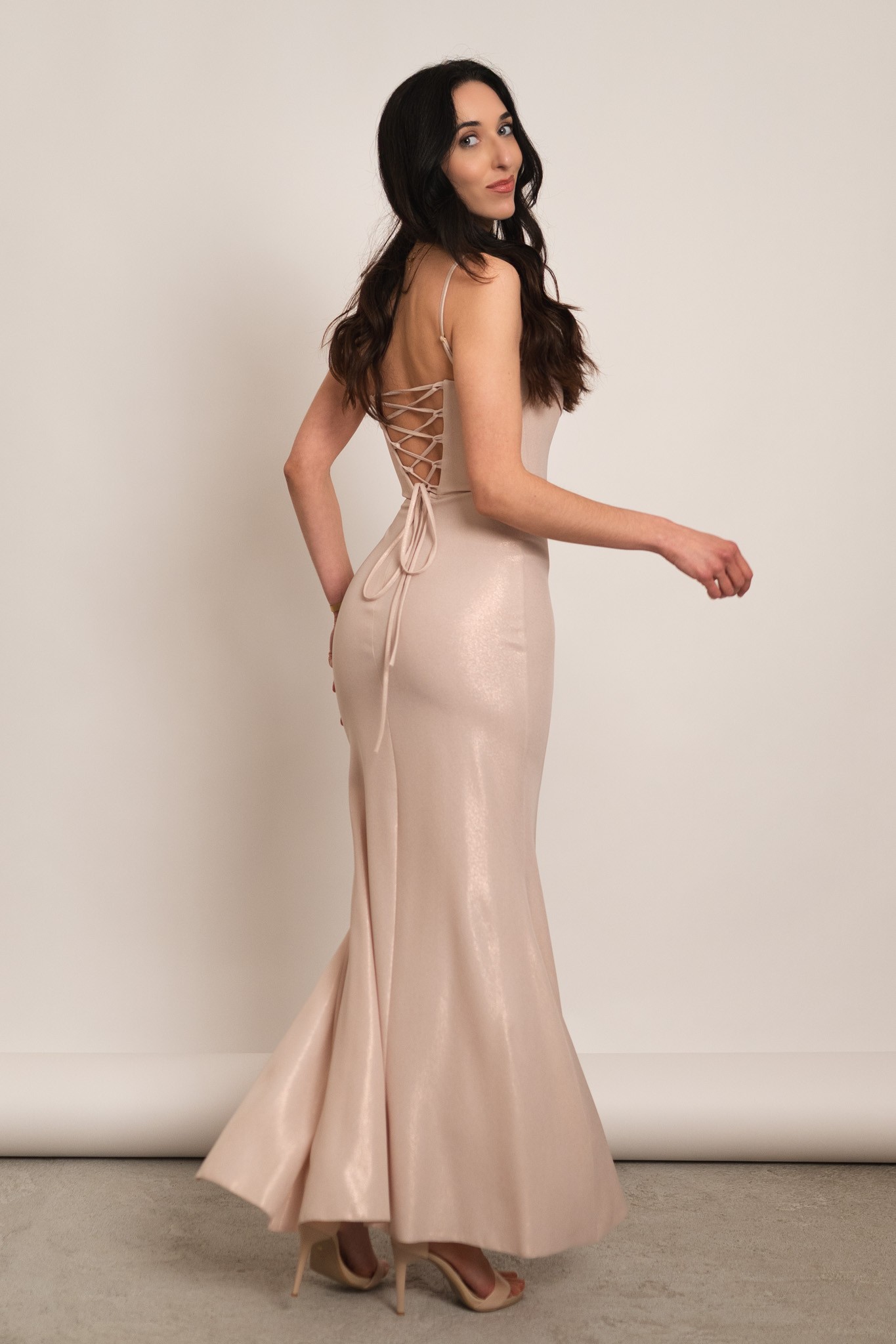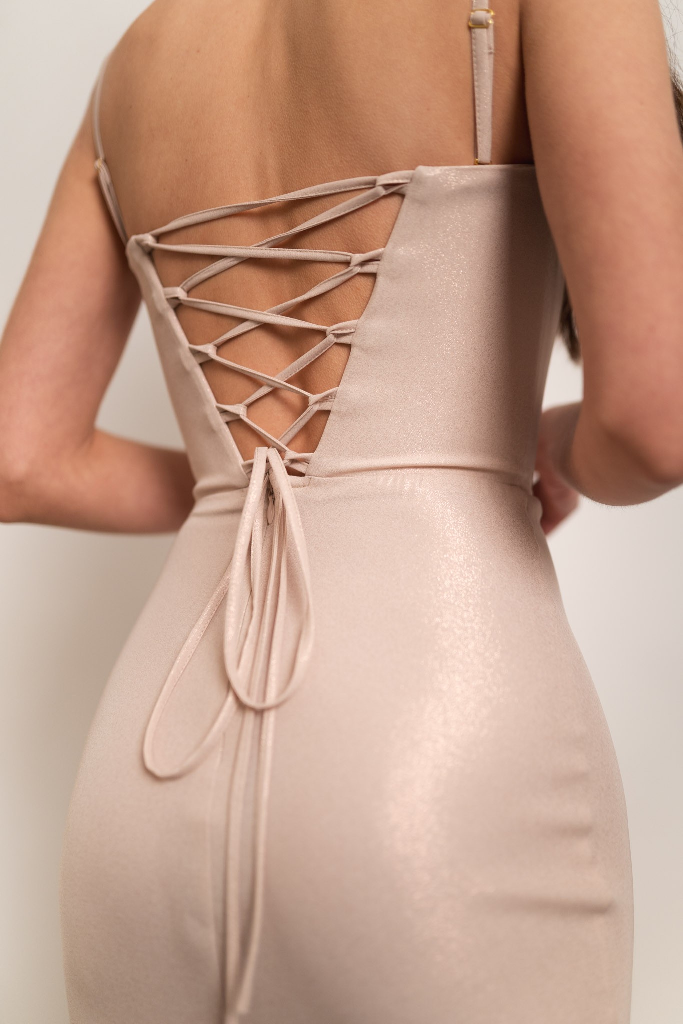 Grenada - błyszcząca gorsetowa sukienka maxi syrenka beżowa