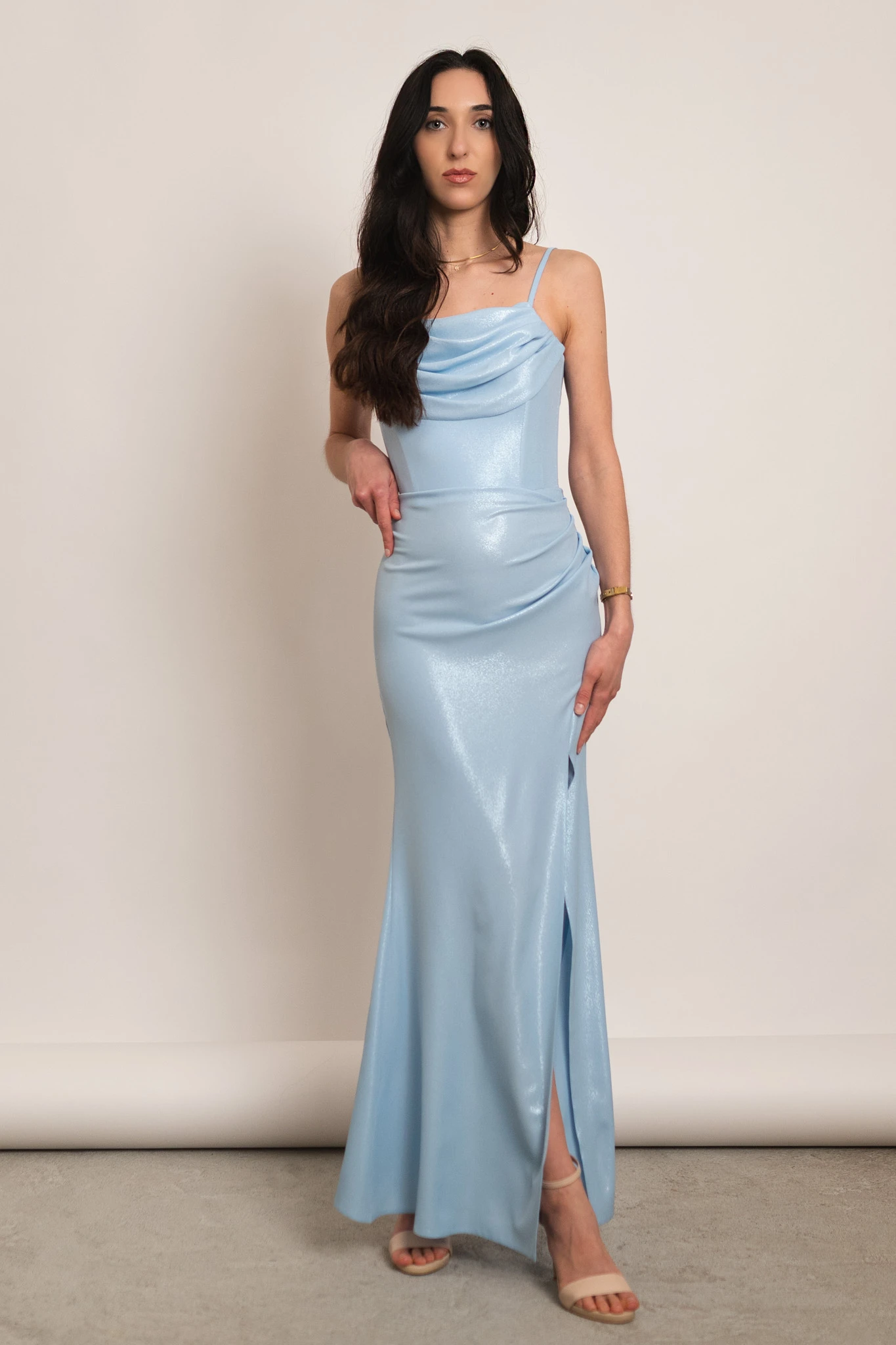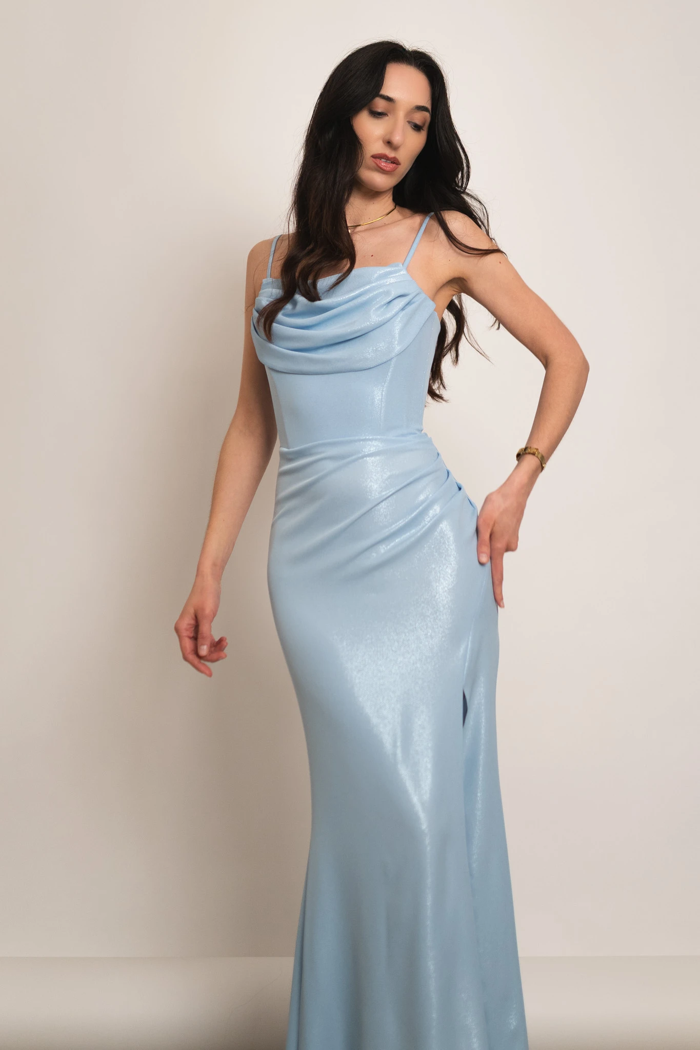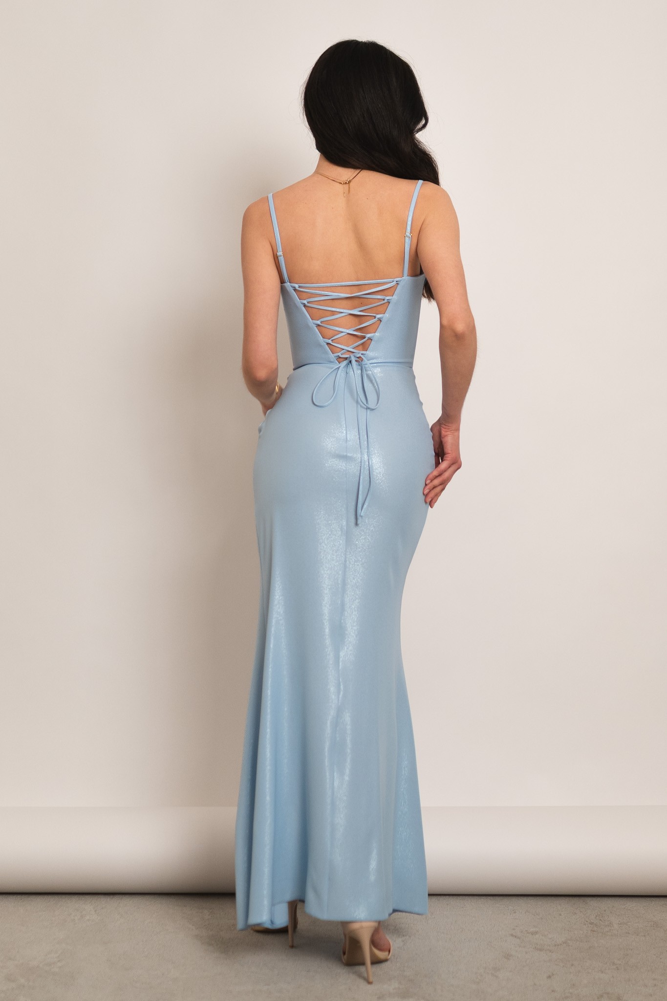 Grenada - błyszcząca gorsetowa sukienka maxi syrenka błękitna