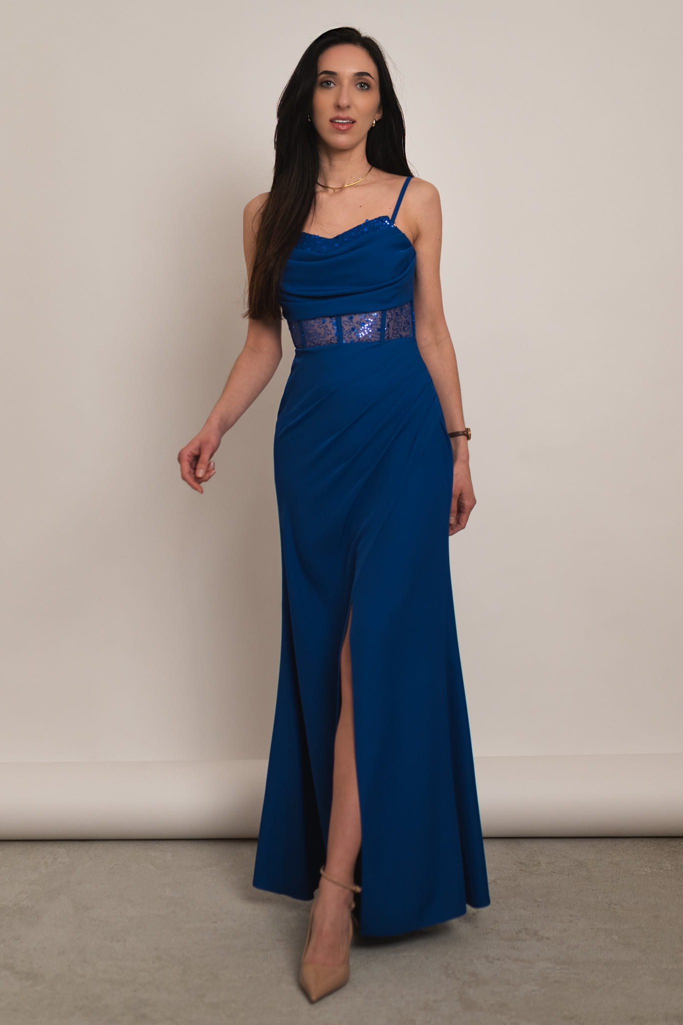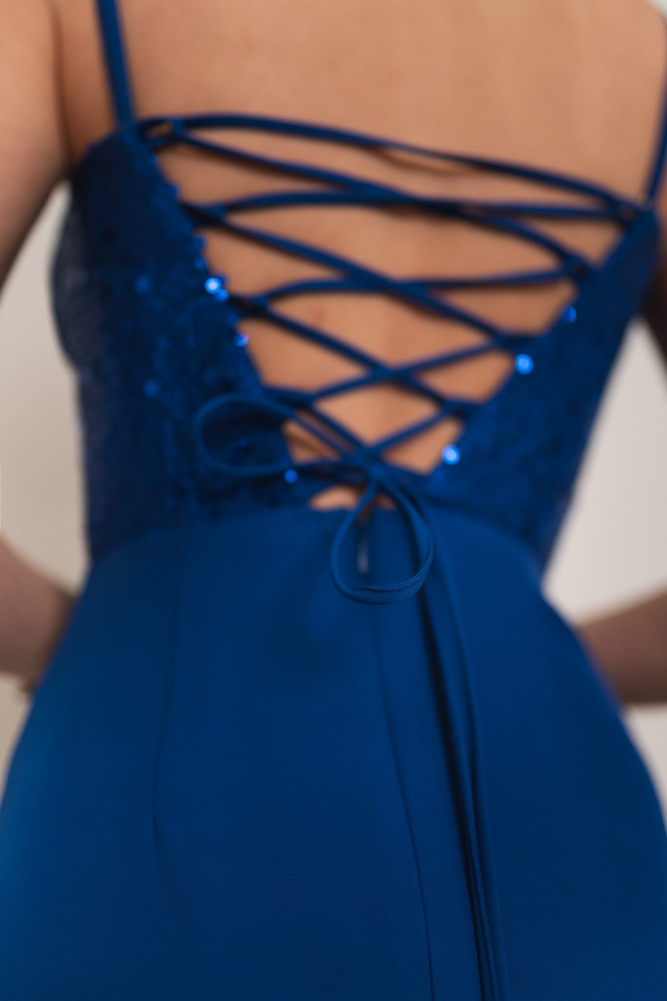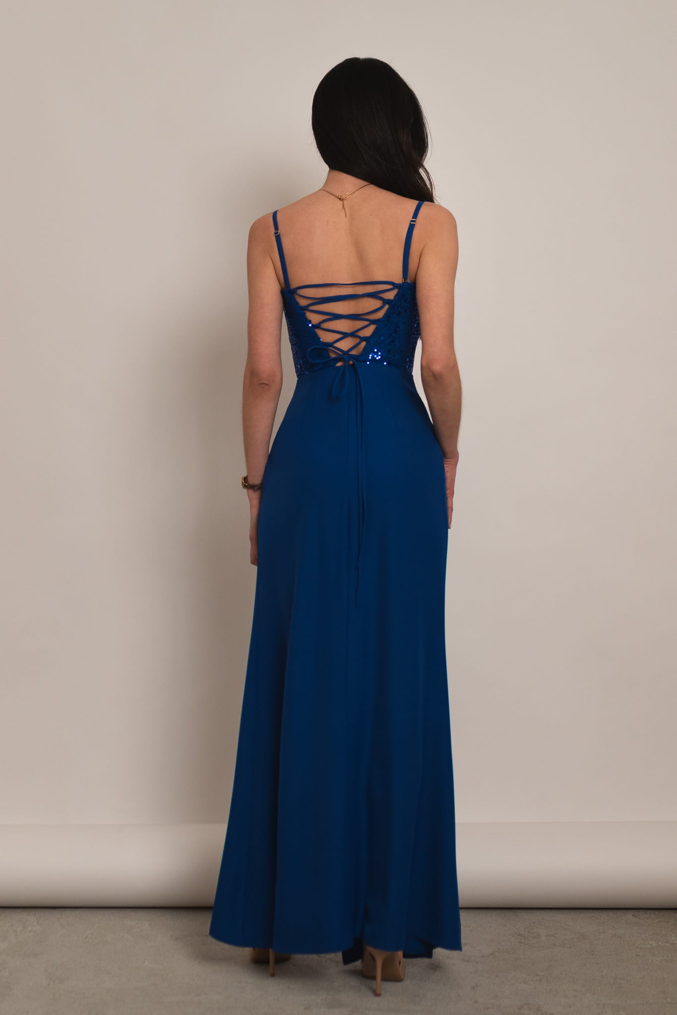 Kordoba - sukienka maxi z ozdobnym gorsetem z cekinami chabrowa