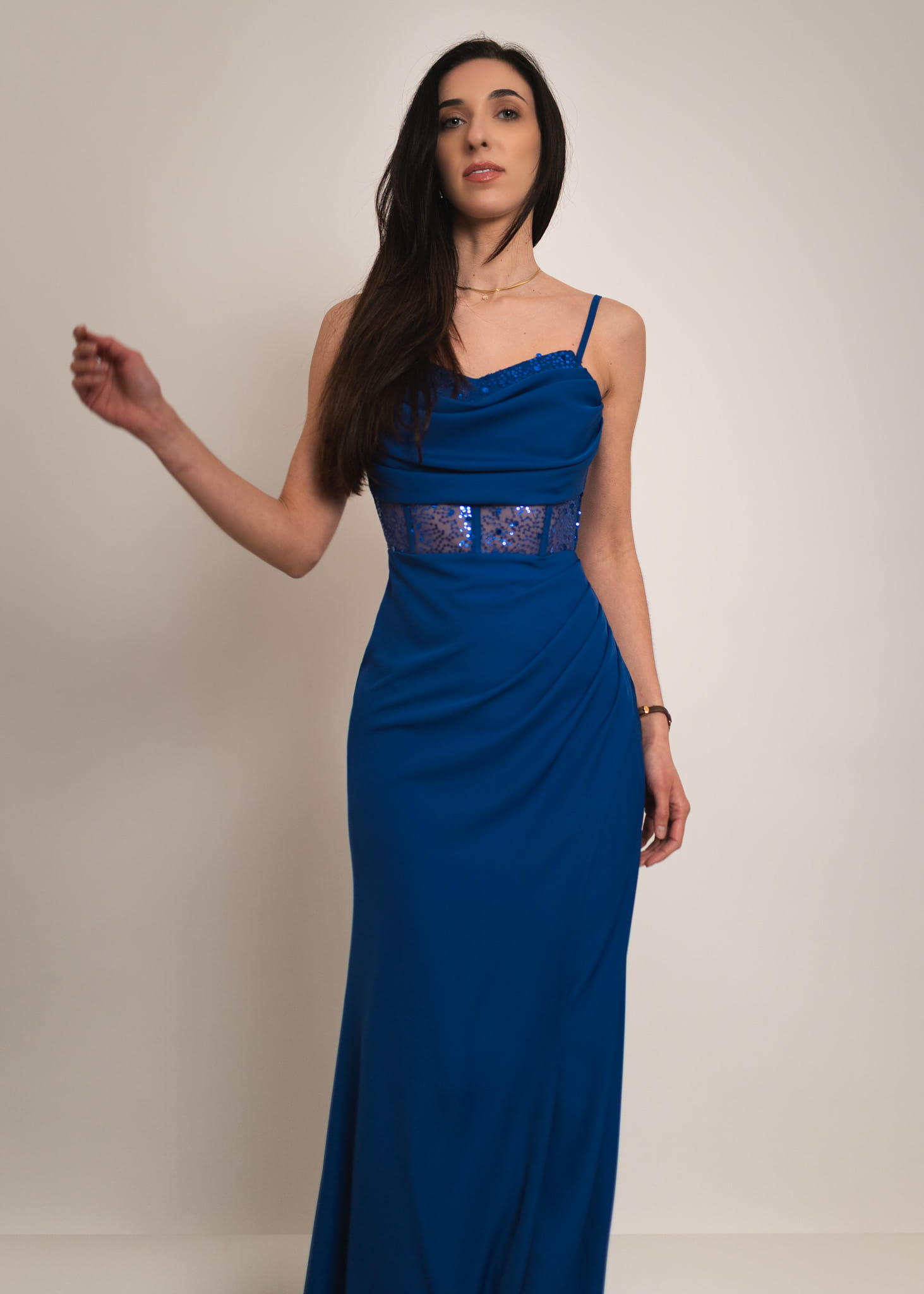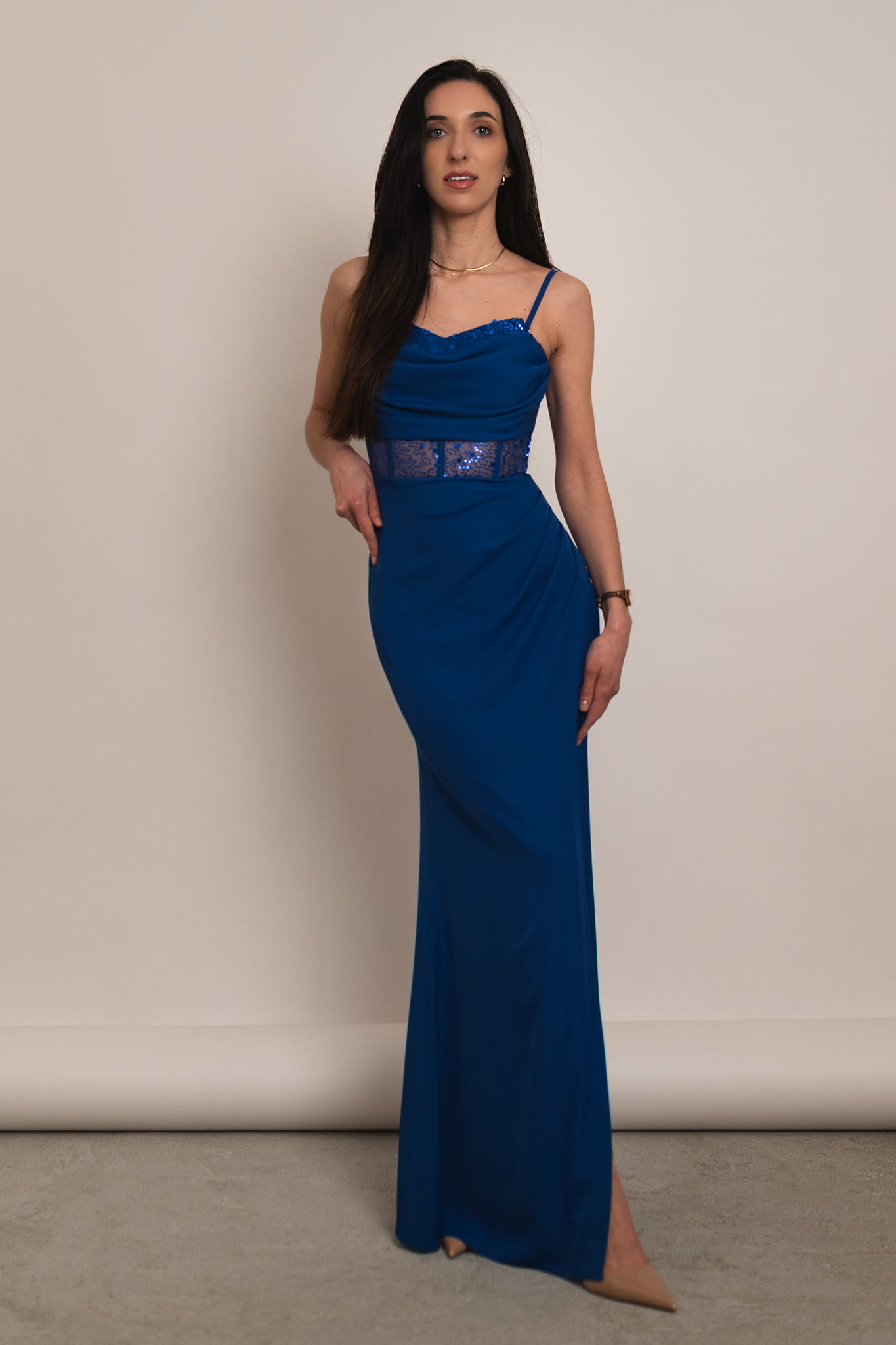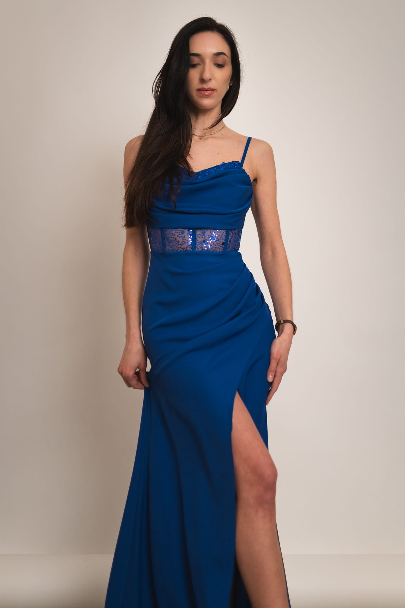 Kordoba - sukienka maxi z ozdobnym gorsetem z cekinami chabrowa