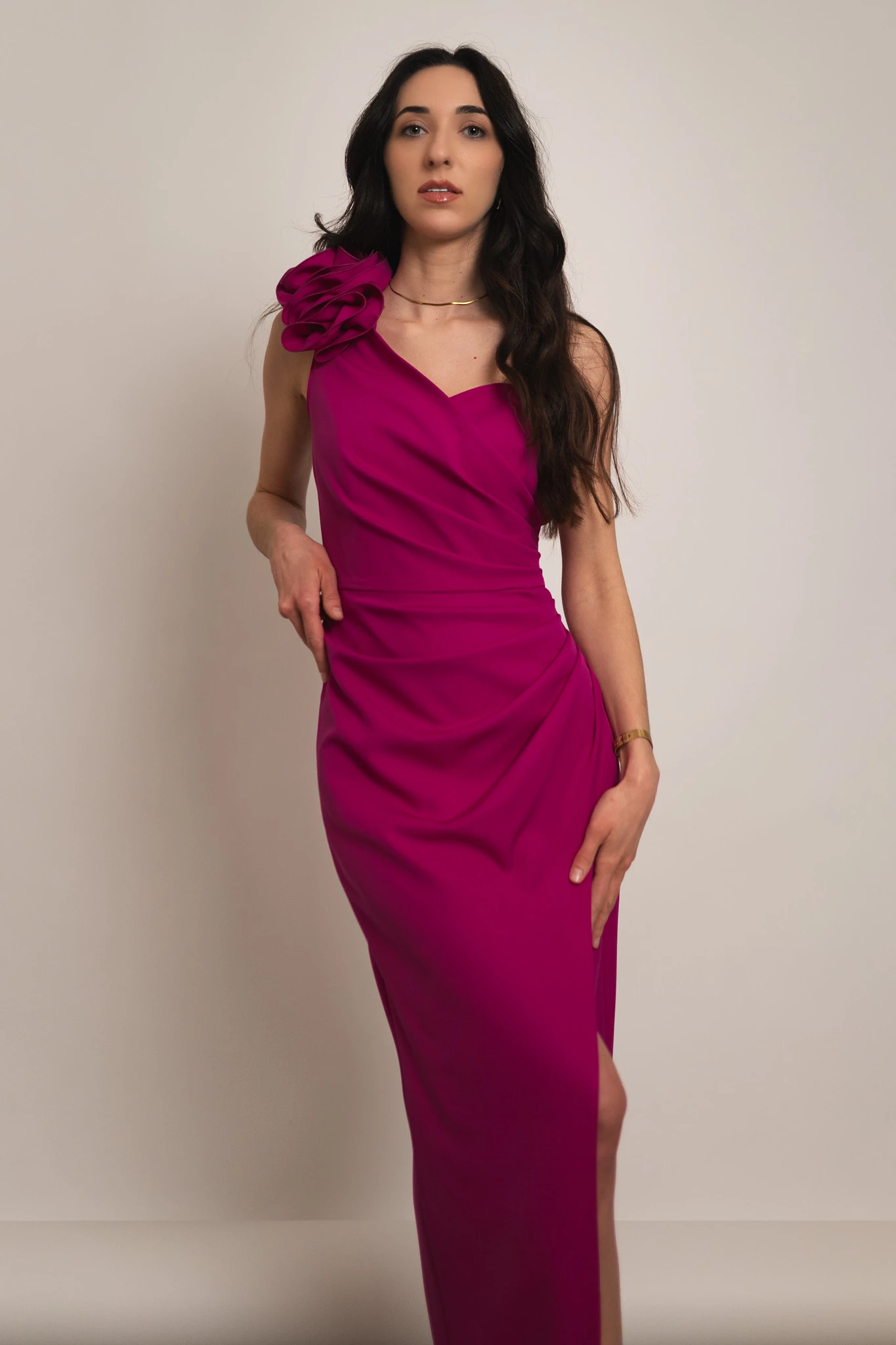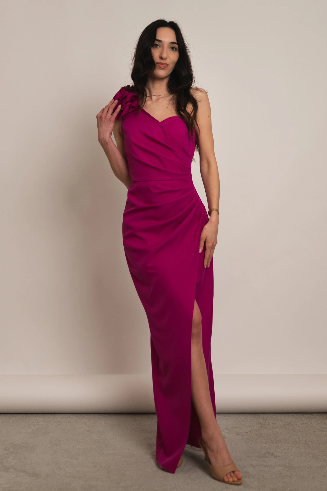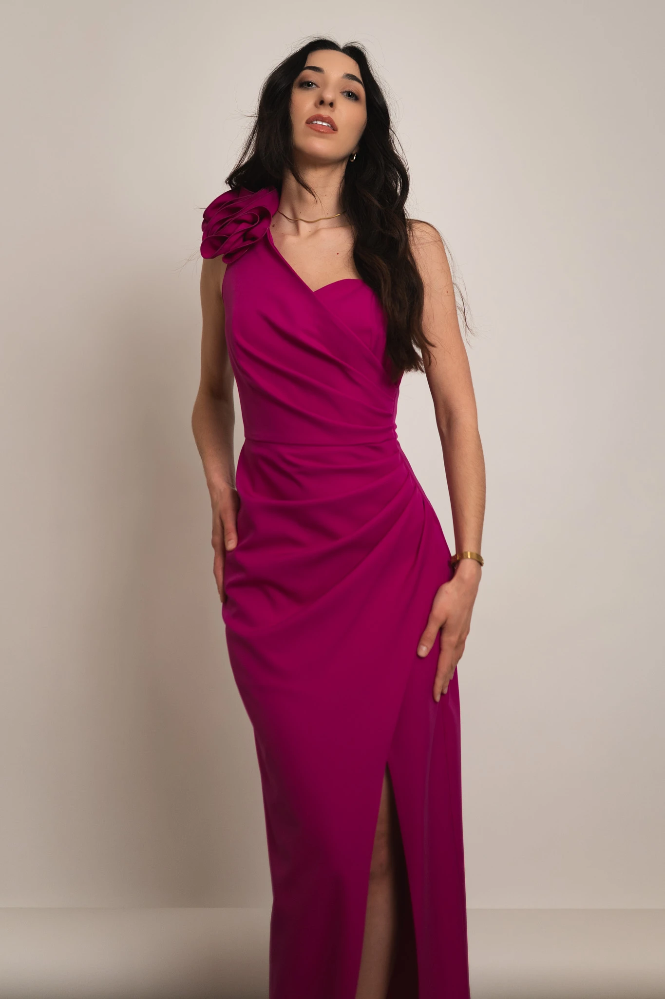 Liwadia - asymetryczna sukienka maxi z kwiatem ciemny róż