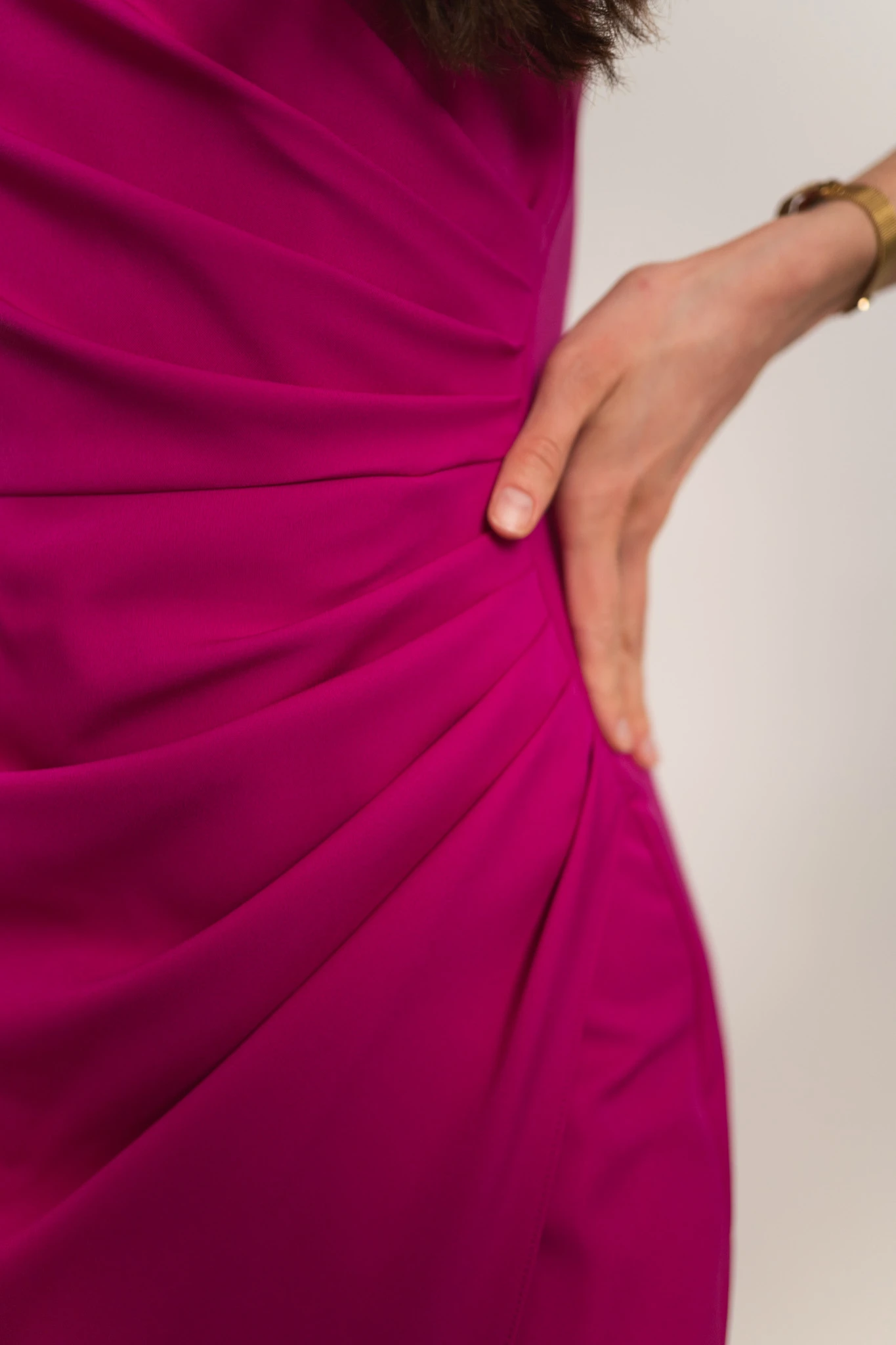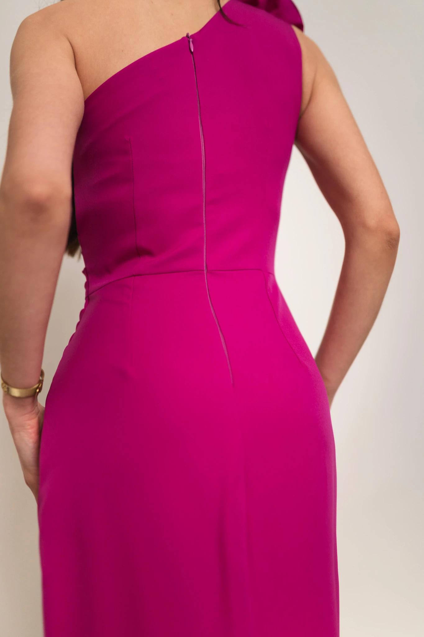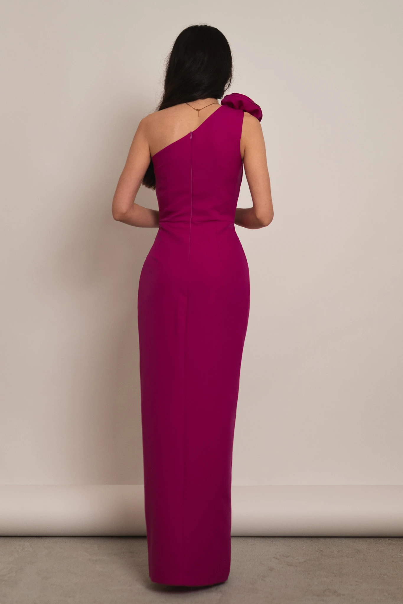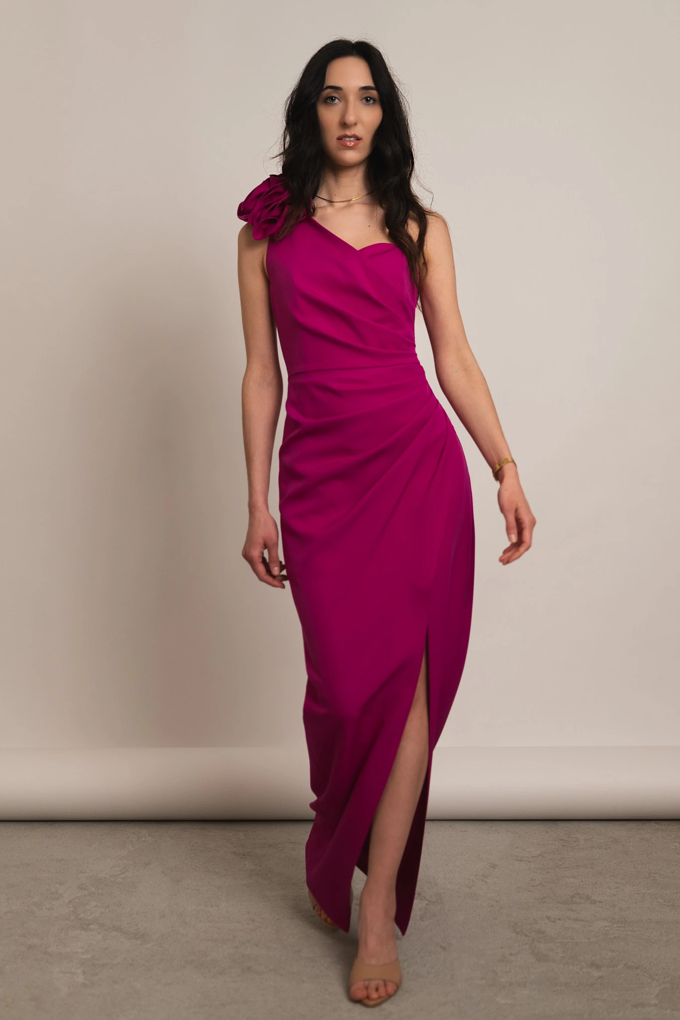 Liwadia - asymetryczna sukienka maxi z kwiatem ciemny róż