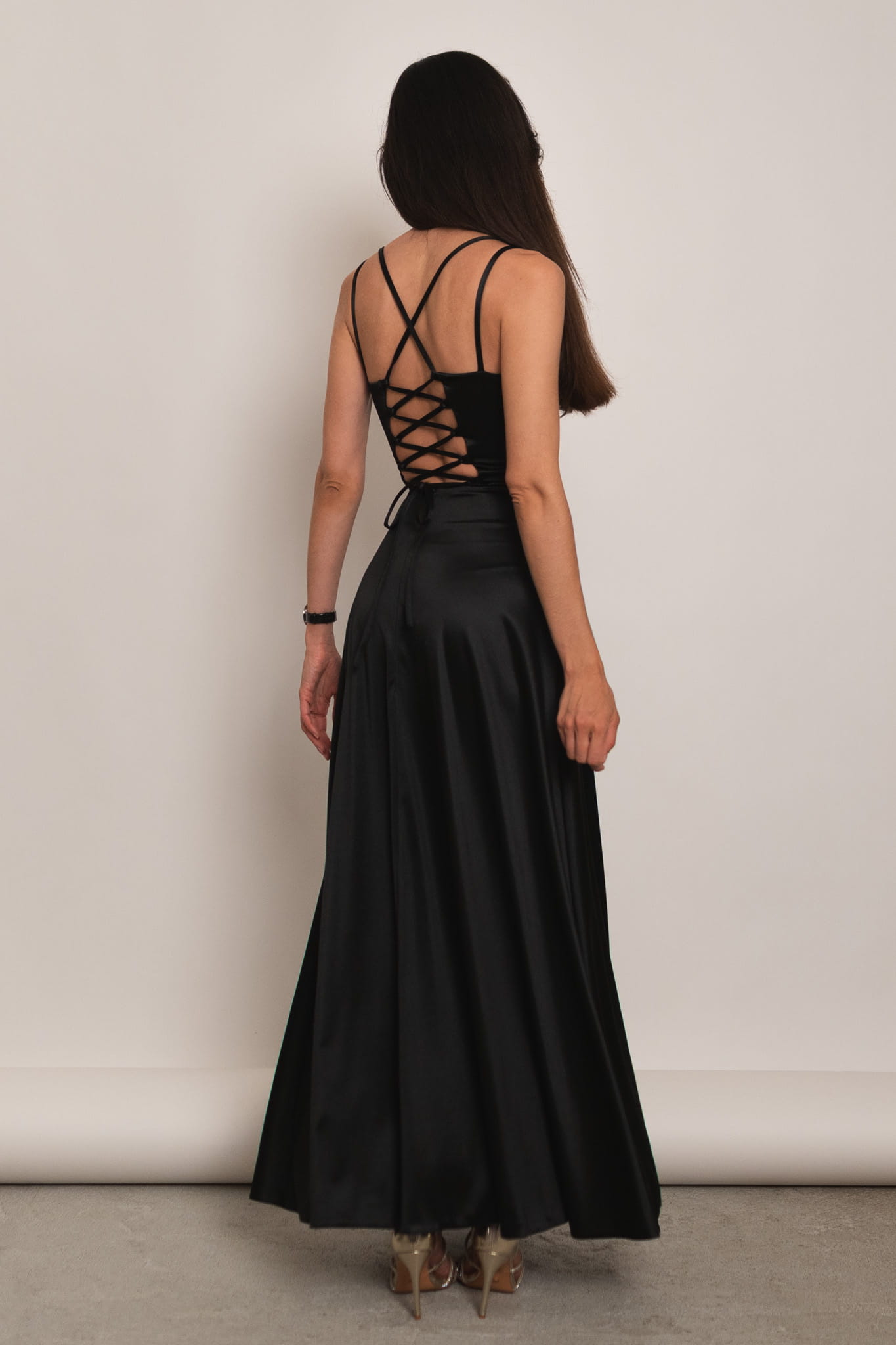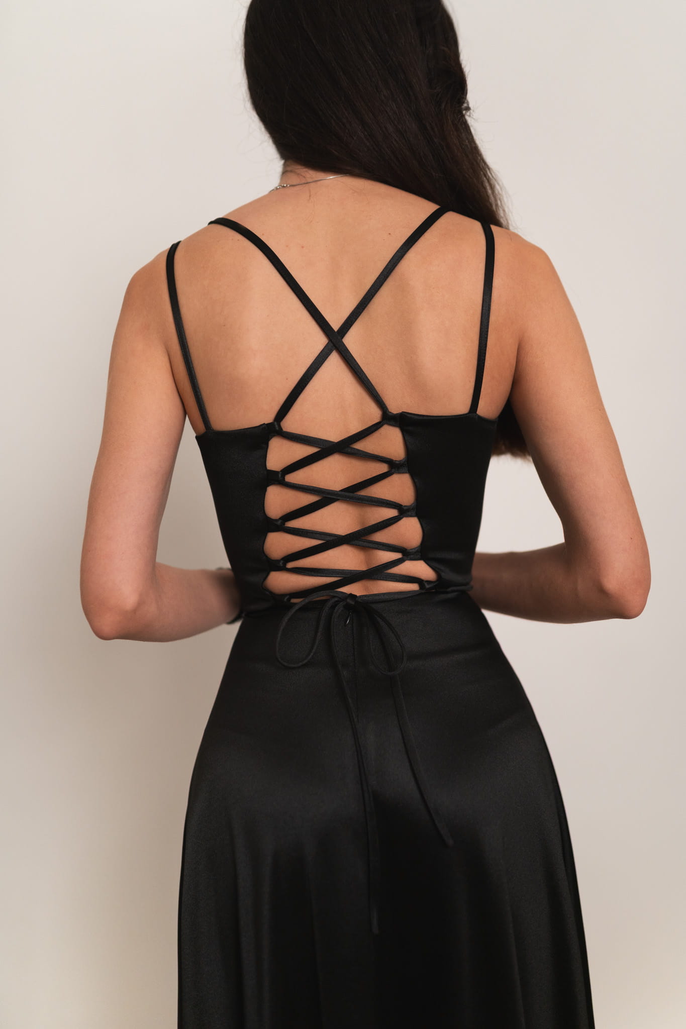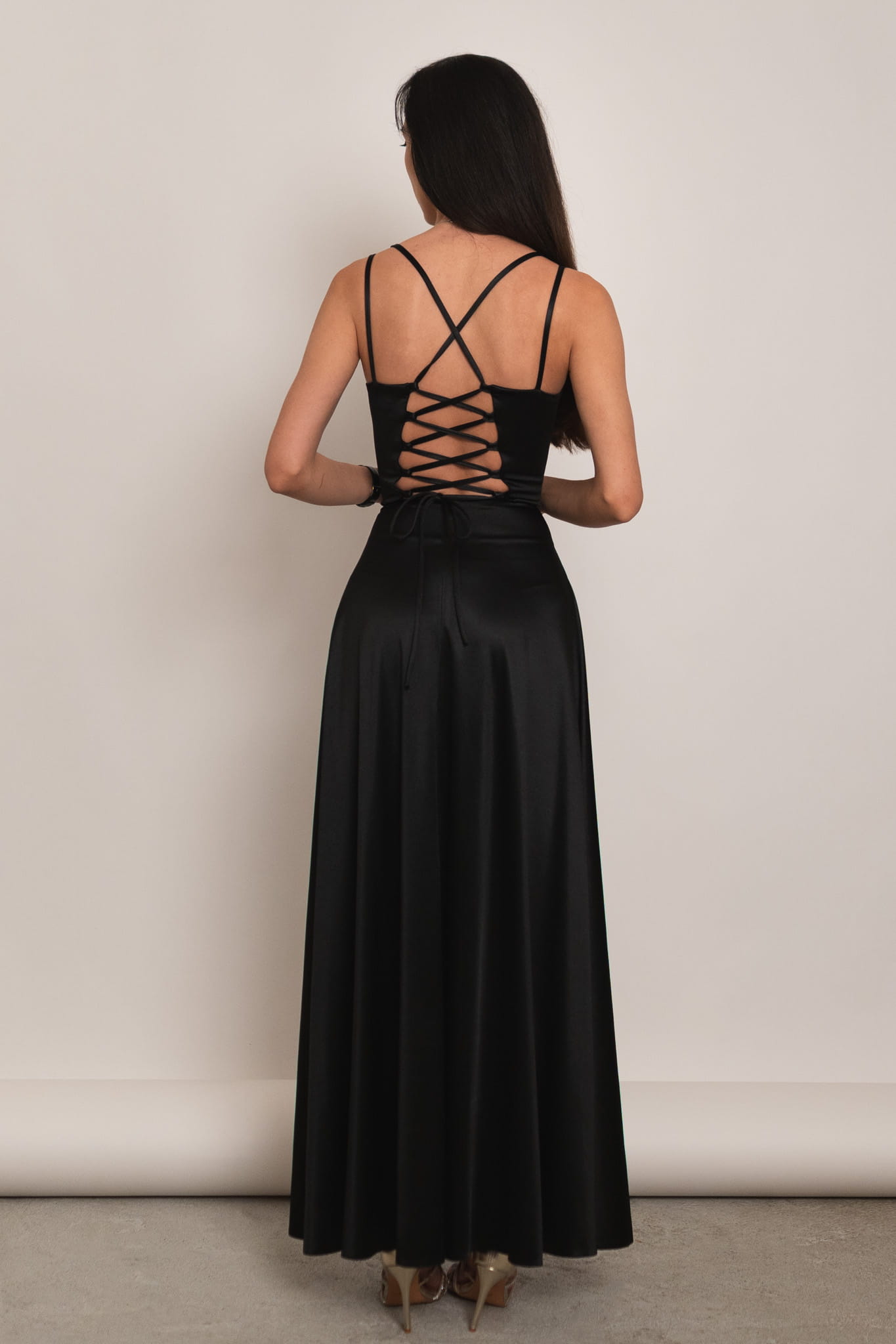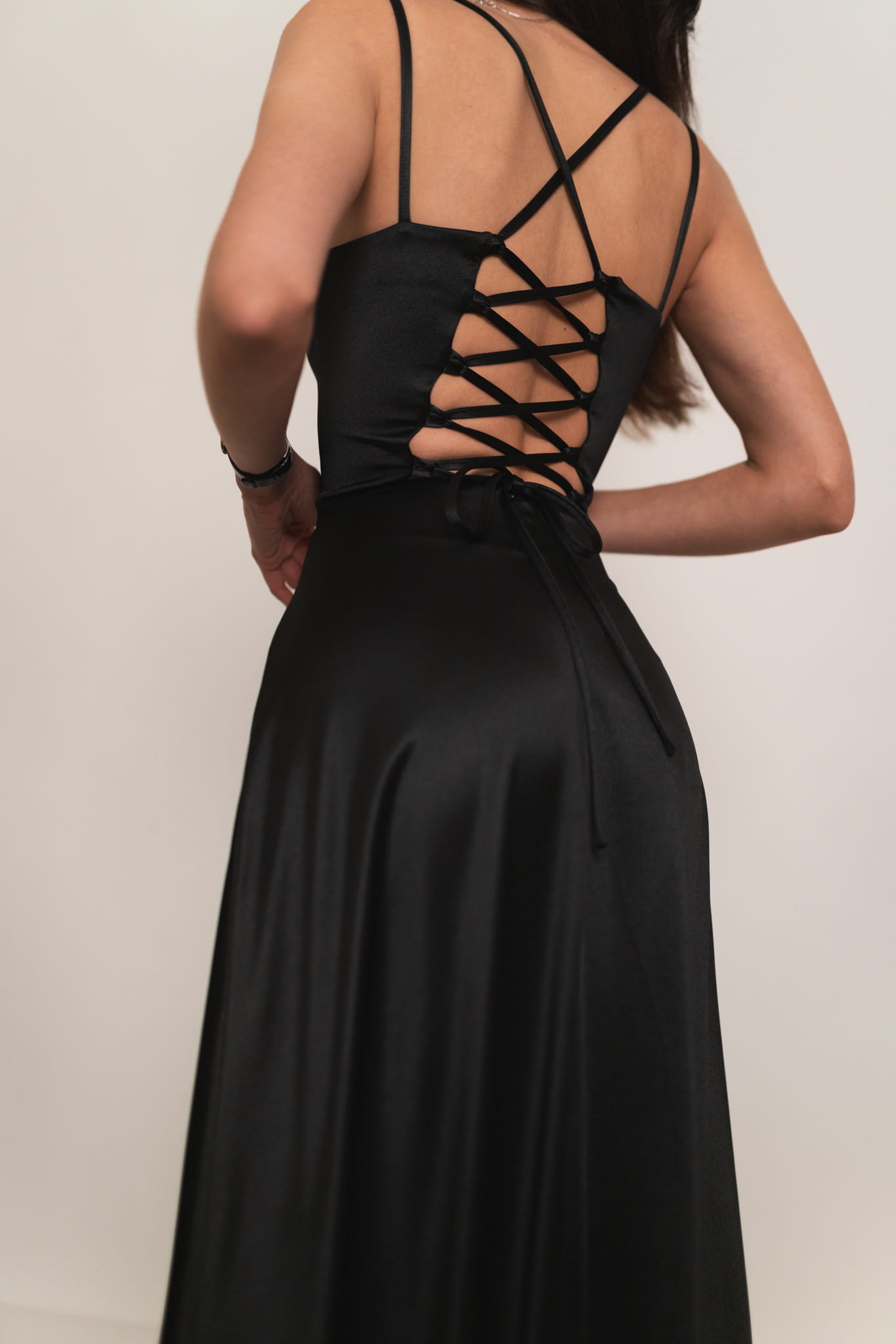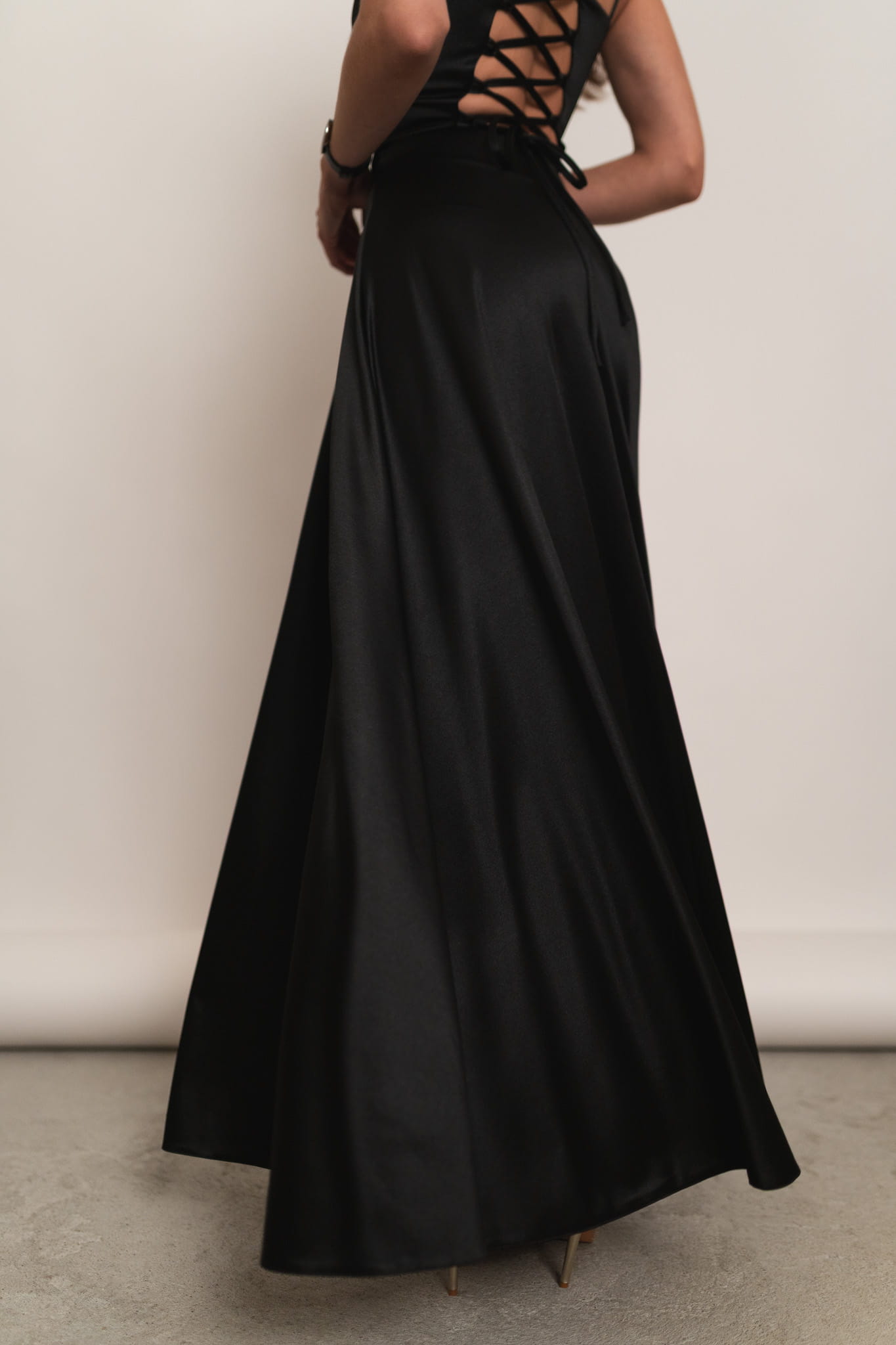 Mijas - satynowa sukienka maxi z gorsetowym wiązaniem czarna