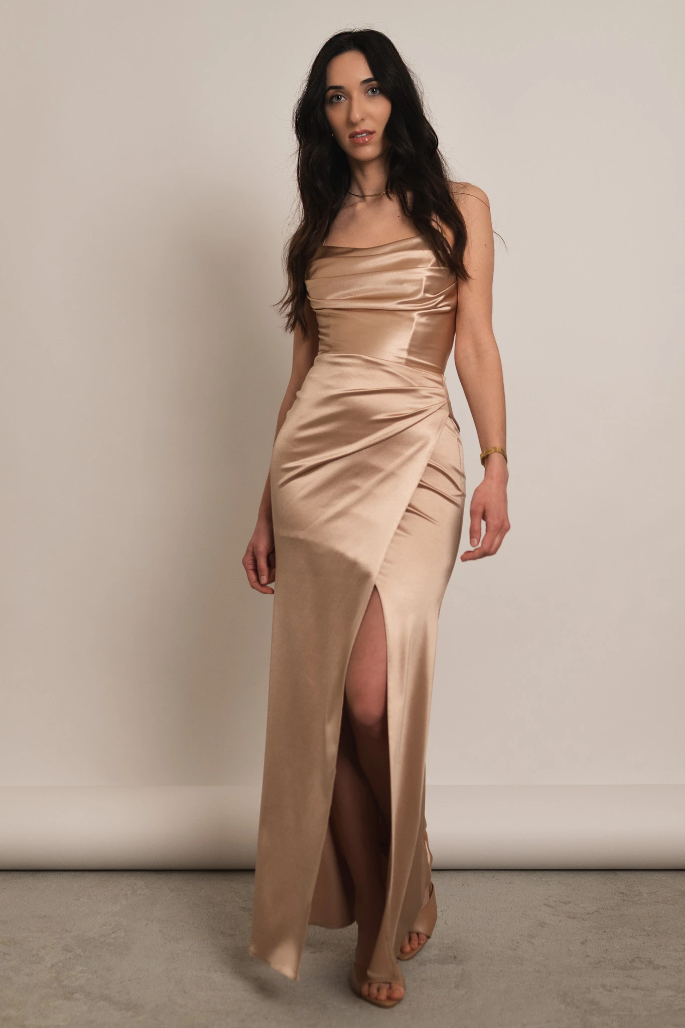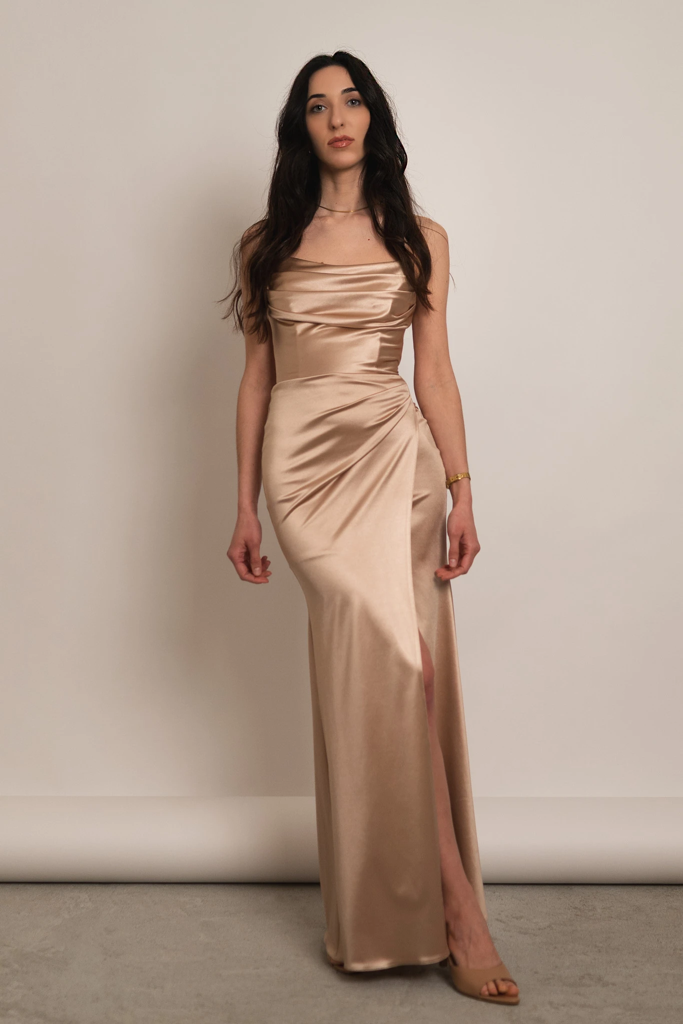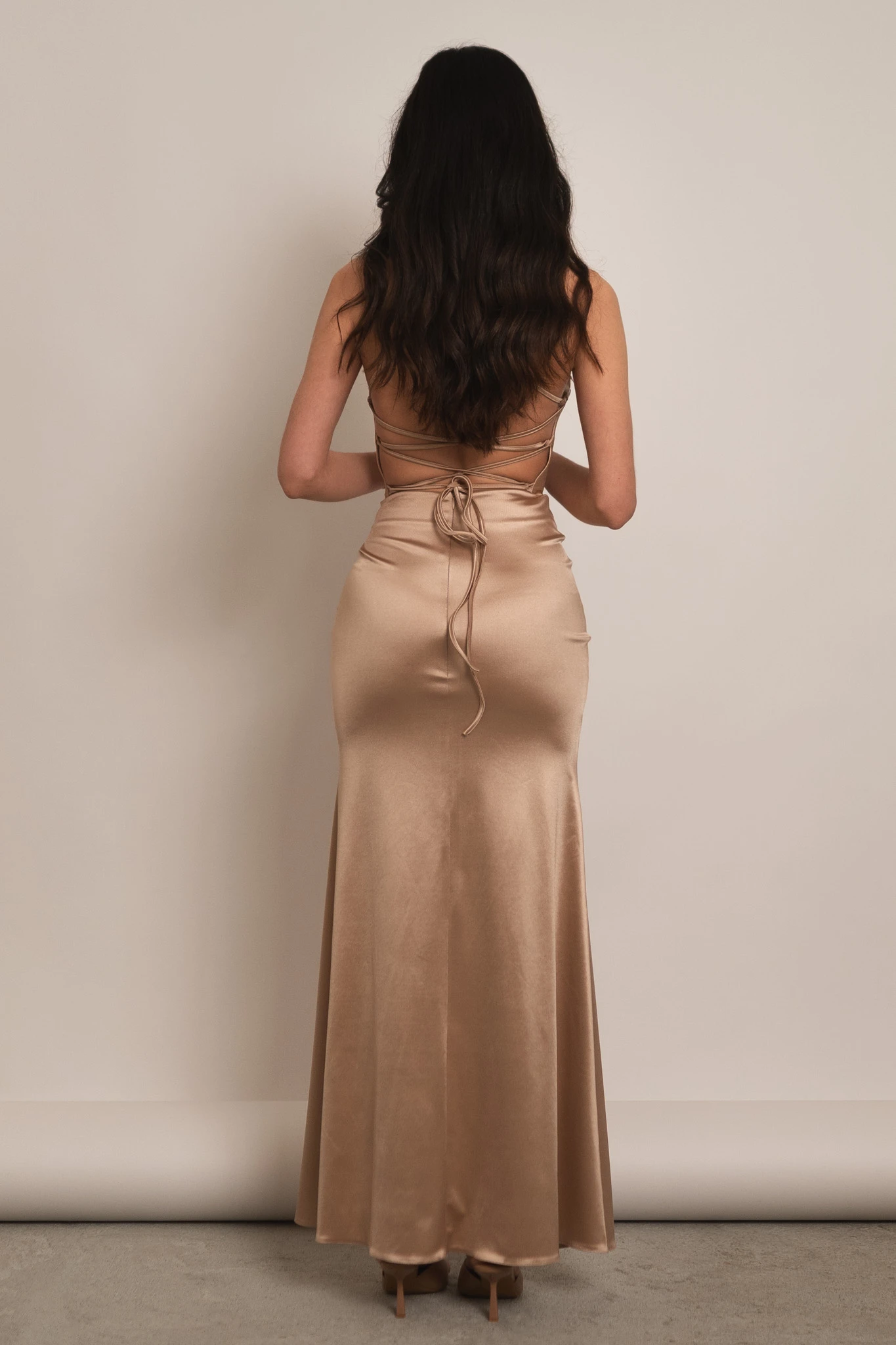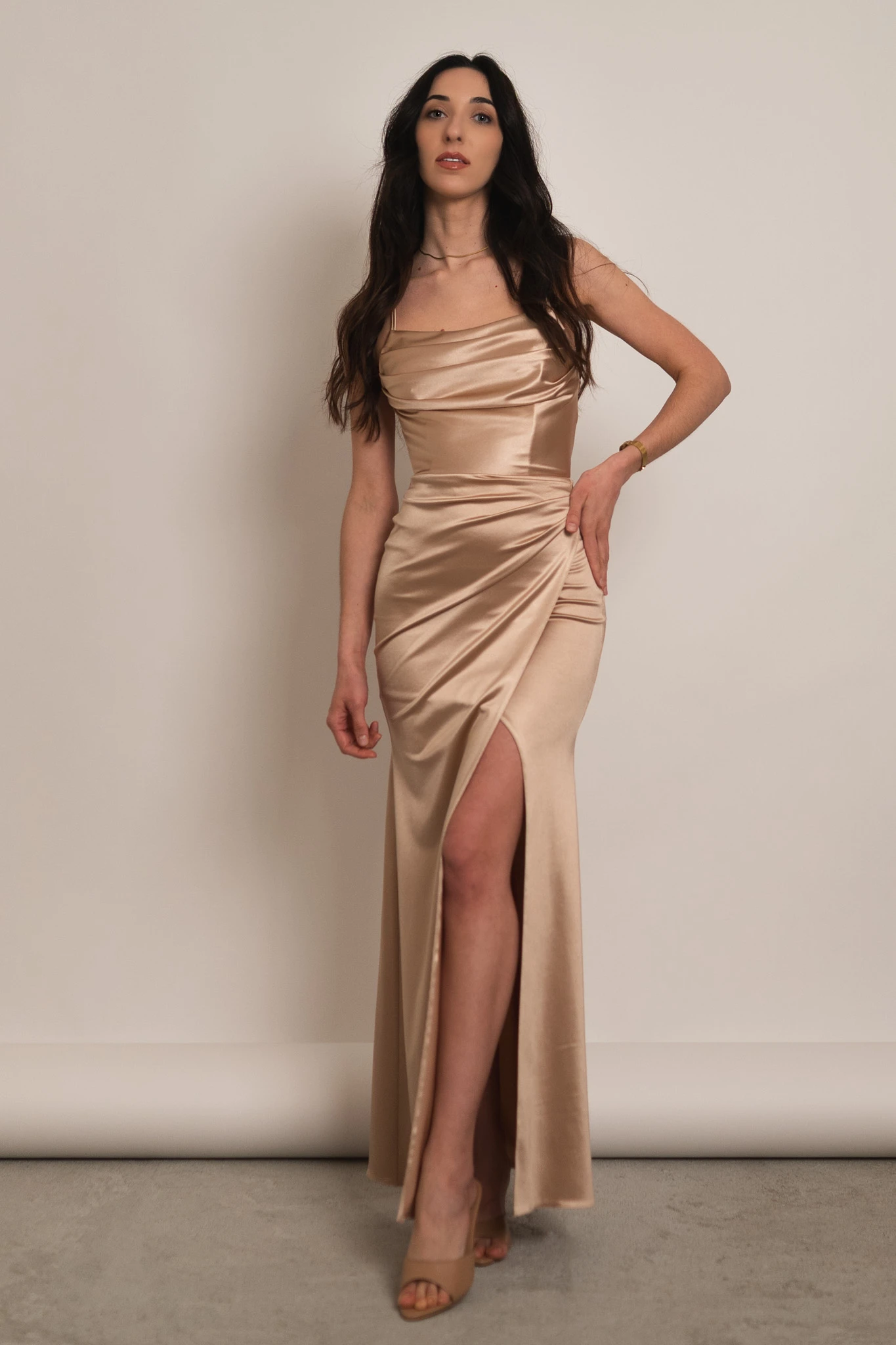 Elegancka sukienka wieczorowa maxi o kroju rybki w wyjątkowym, satynowym wykończeniu to idealna propozycja na wesele, bal, studniówkę czy inne uroczyste okazje. Model w złotym odcieniu pięknie odbija światło, nadając stylizacji luksusowego charakteru i przyciągając spojrzenia. Dopasowana góra z delikatnym, lejącym dekoltem typu woda subtelnie podkreśla biust, a cienkie ramiączka dodają całości lekkości i kobiecego wdzięku.
