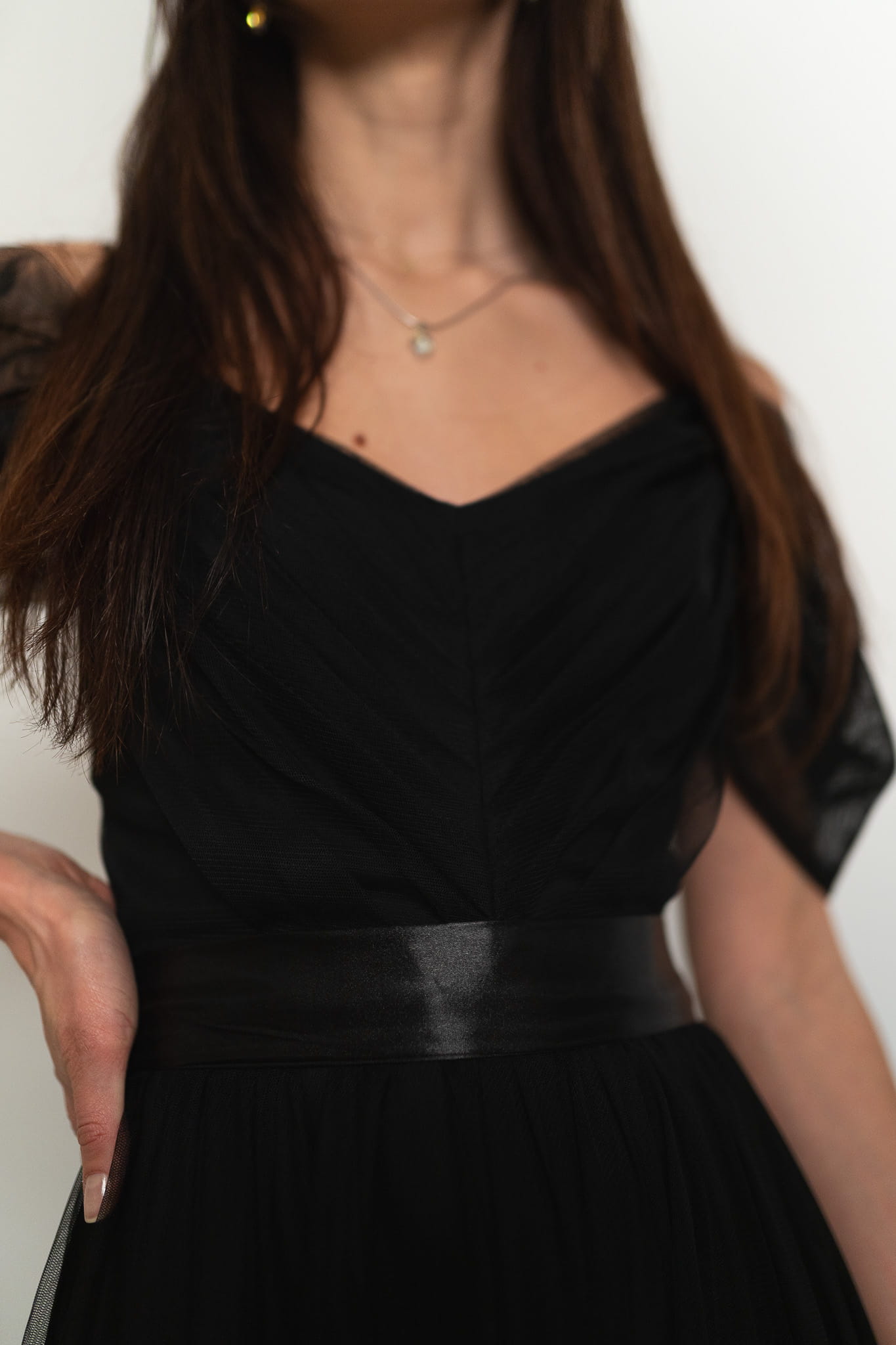 Romantyczna sukienka z opadającymi tiulowymi rękawkami i dekoltem w literę V. Dodatkowe subtelne, cienkie ramiączka zapewnią Ci komfort noszenia. Dół rozkloszowany, odszyty z dużej ilości materiału przez co pięknie porusza się w ruchu. Satynowy pasek w kolorze dołączony jest w zestawie do sukienki. Model Parla dostępny jest w kolorach.